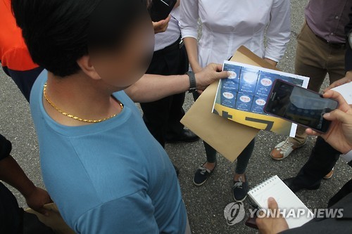 | △ '농약 탄 사이다' 살해사건 피의자 박모(82) 할머니의 사위가 20일 오후 대구지방법원 상주지원에서 경찰 수사에 항의하며 기자들에게 박카스병 제조번호를 설명하고 있다. |