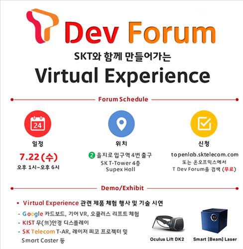 SK텔레콤[017670]은 22일 서울 을지로 본사 사옥에서 구글, 마이크로소프트(MS) 등 국내외 글로벌 정보통신기술(ICT) 기업과 학계 등 다양한 분야의 개발자들이 참석한 가운데 증강현실과 가상현실 등 실감형 멀티미디어 서비스의 현재와 미래를 논의하기 위한 포럼을 개최했다.