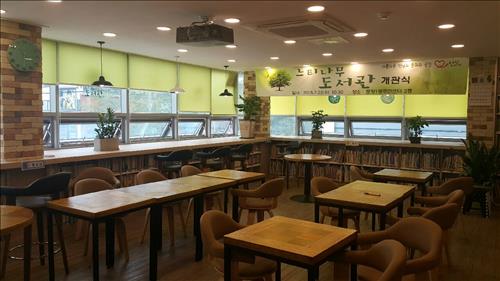 카페용 탁자 10개와 의자 20개, 어린이용 소파 9개를 비치해 북카페처럼 책을 읽을 수 있도록 꾸몄다.