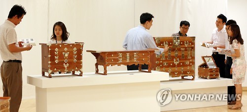 | △ '세대를 잇는 작업-이음' 전시 (서울=연합뉴스) 홍해인 기자 = 포스코1%나눔재단 주최로 22일 서울 대치동 포스코센터에서 열린 '세대를 잇는 작업-이음'전에서 관람객들이 중요무형문화재 제64호 두석장 김극천 선생의 전통 금속공예 작품들을 살펴보고 있다. |