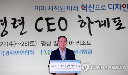 | △ 개회사 하는 허창수 전경련 회장 (평창=연합뉴스) 허창수 전국경제인연합회 회장이 22일 강원 평창군 알펜시아리조트에서 '이미 시작된 미래, 혁신으로 디자인하라'라는 주제로 열린 전경련 CEO 하계포럼에서 개회사를 하고 있다.(평창군 제공) |