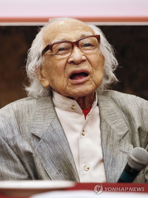| △ 집단자위권 반대 팔 걷은 100살 전직 아사히 기자 (도쿄 교도=연합뉴스) 아사히 신문 소속으로 태평양전쟁의 현장을 취재한 100살의 전직 일본 기자가 집단 자위권 법안 반대에 팔을 걷어 부쳤다. 전직 아사히 기자 무노 다케지(武野武治) 씨가 21일 도쿄에서 다른 언론사 OB들과 함께 기자회견을 하는 모습이다. 2015.7.22 jhcho@yna.co.kr |