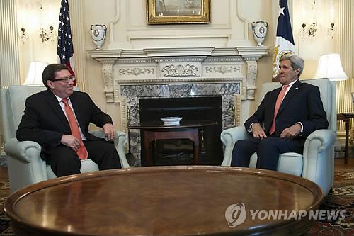 | △ 존 케리 미국 국무장관(오른쪽)과 브루노 로드리게스 쿠바 외교장관이 쿠바 주재 미국대사관을 재개관한 20일(현지시간) 워싱턴의 국무부 청사에서 회담을 하고 있다.(AP=연합뉴스) |