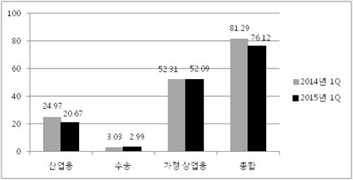 가정·상업용 소비가 지난해 1분기 52억3천100만㎥에서 올해 1분기 52억900만㎥로 0.4% 줄면서 정체 상태를 보인 가운데 산업용 소비는 24억9천700만㎥에서 20억6천700만㎥로 17.3% 급감하면서 전체 소비 감소를 주도했다.