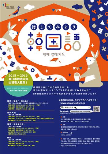 '함께 말해봐요 한국어'란 제목의 이 대회는 오는 12월부터 2016년 2월까지 도쿄(東京), 아오모리(靑森), 니가타(新潟), 오사카(大阪), 후쿠오카(福岡), 가고시마(鹿兒島), 돗토리(鳥取), 오카야마(岡山) 등 8개 주요 도시를 순회하며 개최된다.
