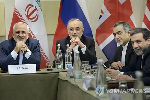 | △ 지난 3월 스위스 로잔에서 진행된 이란 핵협상에 참가한 모하마드 자바드 자리프 이란 외무장관(왼쪽)과 알리 아크바르 살레히 이란 원자력청장(왼쪽에서 두번째) 등 이란측 대표단 모습. (AP=연합뉴스 자료사진) |