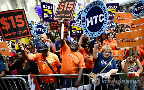 미국에서는 지난해 6월 워싱턴주 시애틀 시의회가 전국 최초로 시간당 최저임금 15달러 인상을 공식화한 것을 시작으로 최근 시급 15달러 인상이 핵심 이슈로 떠올랐다.