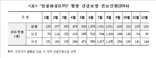 월평균 환자 수(766명)의 3.3배다. 환자수가 가장 적은 1월(225명)의 11.2배에 달한다.