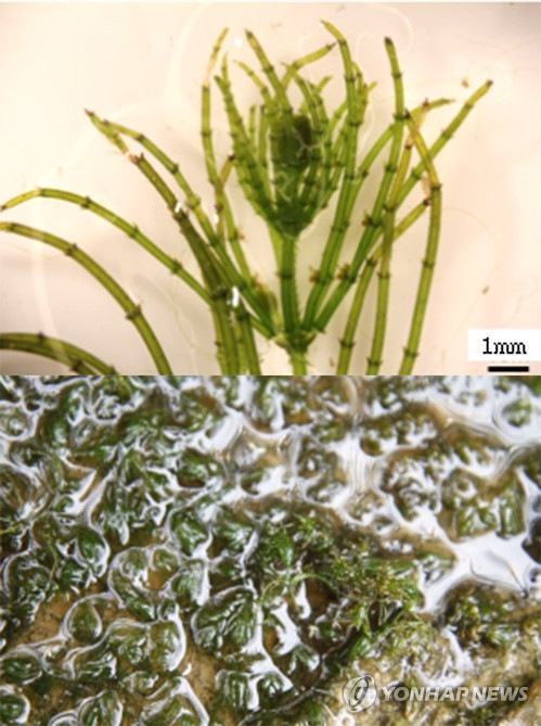 | △ 논에 사는 희귀생물 '맨발쇠뜨기말' 37년 만에 발견 (서울=연합뉴스) 환경부 국립생물자원관은 철새 도래지로 유명한 충남 서산 천수만에서 희귀생물 '맨발쇠뜨기말'의 생육지를 발견했다고 23일 밝혔다. 맨발쇠뜨기말은 윤조류(輪藻類)에 속하며, 논바닥에 붙어 자라는 식물로 20㎝까지 자란다. 윤조류는 줄기를 중심으로 가지가 돌아서 나와 자라 붙여진 이름이다. 맨발쇠뜨기말은 국내에서 고 최두문 교수가 1960년 전남 함평과 1977년 전남 나주에서 한 개체씩 채집한 이래 37년 동안 발견되지 않았다. (환경부 제공) |