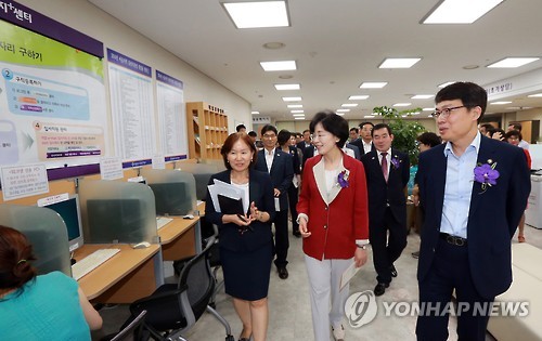 | △ '고용복지+센터' 둘러보는 고영선 차관 (서울=연합뉴스) 고영선 고용노동부차관이 23일 오후 서울 송파구 가락본동 IT벤처타워에서 열린 '서울동부 고용복지+센터' 개소식에 참석해 시설을 둘러보고 있다. 고용복지+센터는 국민이 한 곳만 방문하면 다양한 고용·복지 서비스를 받을 수 있도록 여러 기관이 한 공간에서 서비스를 제공하는 곳이다. (고용노동부 제공) |