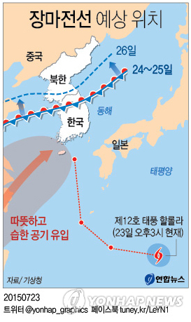 장마전선과 태풍의 영향으로 중부지방에는 24∼25일에 시간당 30㎜ 이상 강한 비가 내릴 것으로 예상된다.