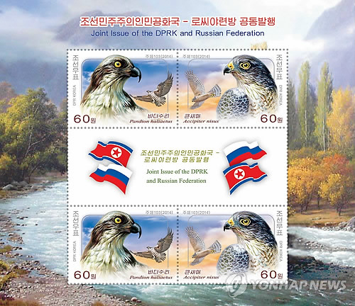 | △ 북한, 러시아 영화제 개막…김정은 '큰 관심' 표명 최근 북한 평양에서 개막한 2차대전 승전 70주년 기념 러시아 영화 주간 행사에 북한 국방위원회 제1위워낮잉 큰 관심을 나타낸 것으로 전해졌다. 사진은 작년 북·러 외교관계 수립(10월 12일) 66주년을 맞아 양국이 발행한 공동우표. |
