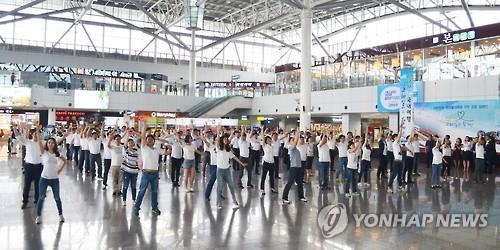 | △ (부산=연합뉴스) 코레일 부산경남본부는 21일 오전 부산역에서 지자체, 한국관광공사, 여행업계 등이 참석한 가운데 메르스로 침체된 지역 경제를 살리고 국내 여행을 촉진하기 위한 캠페인을 벌였다. 캠페인 참가자들이 국내 여행을 촉진하자는 플래시몹을 펼치고 있다. 2015.7.21 << 코레일 >> wink@yna.co.kr |