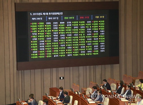 | △ 2015년도 추가경정예산안 통과 (서울=연합뉴스) 이상학 기자 = 24일 국회에서 열린 제335회 국회(임시회) 제2차 본회의에서 2015년도 제1회 추가경정예산안이 통과되고 있다. |