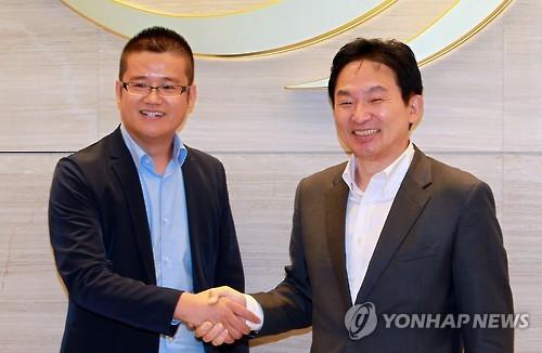 | △ )제주=연합뉴스) 김호천 기자 = 원희룡(오른쪽) 제주지사가 23일 중국 베이징에서 쉬진 봉황넷 부총재를 만나 악수하며 기념촬영을 하고 있다. 2015.7.24 <<제주도 제공>> |