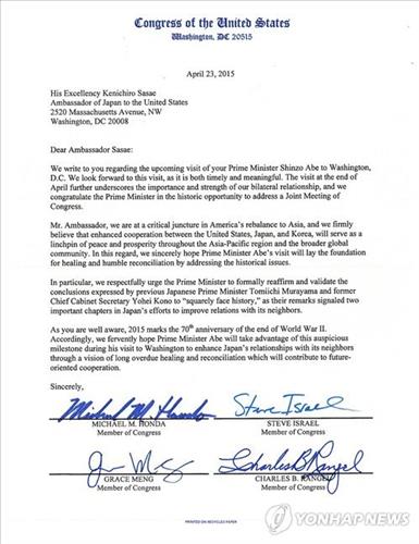 24일(현지시간) 한인 풀뿌리단체인 시민참여센터(KACE)에 따르면 지난 4월 말 아베 총리의 미국 의회 합동연설에 앞서 위안부 문제해결을 촉구하는 연명서한에 참여했던 민주·공화 의원 25명이 위안부 결의안의 의미를 되새기고 이행을 촉구하는 의미의 '121 코커스'를 만들 예정이다.