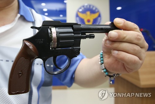 | △ 새마을금고 강도 용의자의 장난감 권총 (서울=연합뉴스) 임헌정 기자 = 서울 서초구 잠원동 새마을금고 강도 용의자가 범행 6일 만에 경찰에 붙잡혔다. 경찰은 현상금 1천만원을 걸고 공개수배했지만 이번에도 폐쇄회로(CC)TV 분석이 용의자 검거에 결정적인 역할을 했다. 서울 서초경찰서는 26일 정오께 강남구 수서동 한 아파트에 숨어 있던 강도 용의자 최모(53)씨를 검거해 조사하고 있다. 사진은 용의자가 범행에 이용한 장난감 권총을 경찰이 공개하는 모습. 2015.7.26 kane@yna.co.kr |
