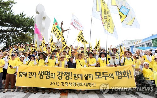 (제주=연합뉴스) 박지호 기자 = 제주해군기지 건설중단을 촉구하는 '2015 강정생명평화대행진'이 '함께 걷자, 생명의 강정! 함께 살자, 모두의 평화!'를 주제로 27일 첫발을 내디뎠다.