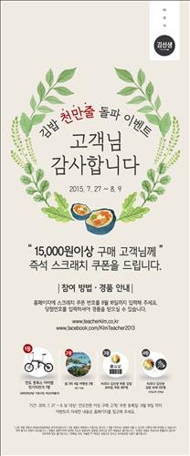매장에서 1만5천원 이상 주문하는 고객은 전기 자전거와 괌 3박4일 여행권, 김밥 쿠폰 등이 걸린 스크래치 복권을 받을 수 있다.