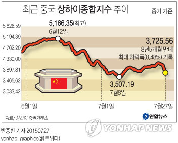 지난주 발표된 중국 제조업 구매관리자지수(PMI)가 48.2로 15개월 만에 최저치로 떨어진데다 이날 발표된 6월 산업 이익도 전년 같은 기간보다 0.3% 하락한 것으로 나타났다.