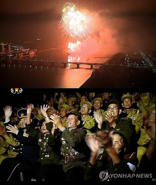 | △ 북,정전협정 기념 축포행사 (서울=연합뉴스) 북한의 조선중앙TV는 27일 평양대동강반에서 정전협정 체결('전승절') 62주년을 기념해 불꽃놀이(축포발사)행사를 실황중계했다. 여기에는 평양시내 주민들과 제4차 전쟁노병대회 참가자들이 참석했다. 2015.7.27 nkphoto@yna.co.kr |