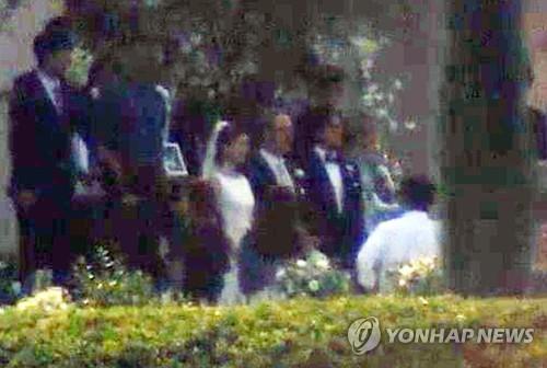 | △ 배우 배용준(가운데 세사람중 오른쪽)과 박수진(왼쪽)이 27일 오후 서울 광진구 쉐라톤 그랜드 워커힐 애스톤하우스에서 열린 결혼식에서 손님을 맞이하고 있다. (연합뉴스TV 캡처) |