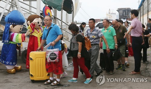| △ 메르스 사실상 '종식'…인천 방문한 '유커' (인천=연합뉴스) 윤태현 기자 = 정부가 사실상 국내 중동호흡기증후군(메르스) 종식을 선언한 가운데 27일 오후 인천시 중구 인천항으로 중국 관광객들이 입국하고 있다. |