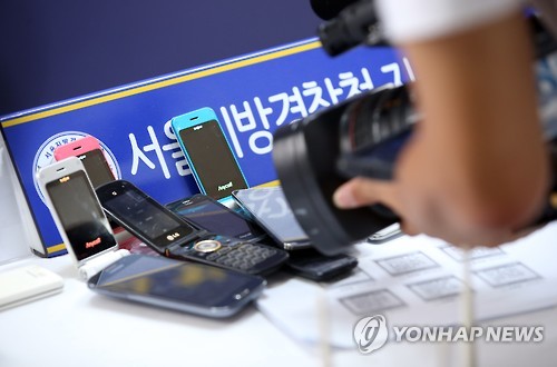 | △ 증거자료 살펴보는 취재진 (서울=연합뉴스) 박동주 기자 = 서울지방경찰청 지능범죄수사대는 한국인을 상대로 전화금융사기 행각을 벌여 수십억원을 챙긴 혐의(사기 등)로 광저우와 칭다오에 있는 보이스피싱 2개 조직 41명을 검거했다고 28일 밝혔다. 28일 중랑구 묵동 서울지방경찰청 지능범죄수사대 브리핑룸에 대포폰 등 증거 관련 자료가 놓여 있다. |