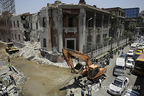 | △ 駐이집트 이탈리아 영사관 폭탄 테러…10명 사상 (카이로 AP=연합뉴스) 이집트 카이로 주재 이탈리아 영사관 출입구 주변에서 11일(현지시간) 차량 폭탄이 폭발, 최소 1명이 숨지고 경찰과 보행자 등 9명이 부상했다. 이 폭발로 영사관 건물 외벽과 경찰초소가 크게 부서지고 수도관이 터져 물웅덩까지 생겼다. 사건 직후 수니파 무장조직 이슬람국가(IS)는 폭탄 공격이 자신들의 소행이라고 주장했다. 사진은 중장비가 동원돼 부서진 건물 파편들을 치우고 있는 모습. marshal@yna.co.kr (AP Photo/Thomas Hartwell) |