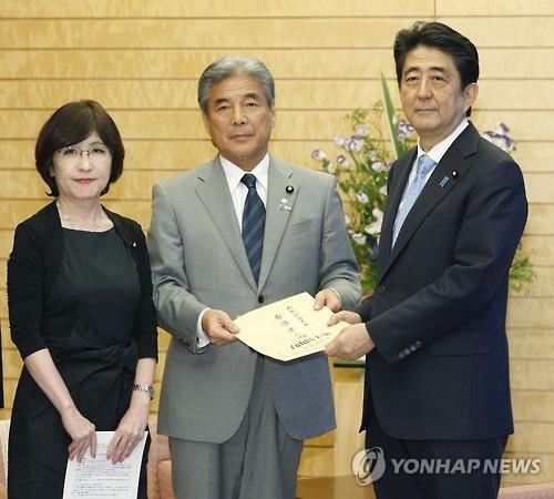 | △ 아베 신조(安倍晋三, 오른쪽) 일본 총리가 28일 오후 도쿄 총리관저에서 나카소네 히로후미(中曾根弘文, 가운데) 전 외무상과 이나다 도모미(稻田朋美) 자민당 정조회장을 만나 자민당 '일본의 명예와 신뢰를 회복하기 위한 특명위원회'의 제안서를 받고 있다.(교도=연합뉴스) |