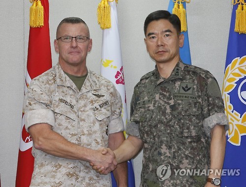 | △ 한미, '탄저균 합동실무단' 첫 회의 (서울=연합뉴스) 황광모 기자 = 29일 오전 서울 용산 국방부에서 열린 한미 탄저균 합동실무단 전체회의에서 한국 측 실무단장 장경수 국방부 정책기획관(오른쪽)과 미국 측 실무단장 로버트 헤드룬드(Robert Hedelund) 주한미군사령부 기획참모부장이 서로 악수하고 있다. |