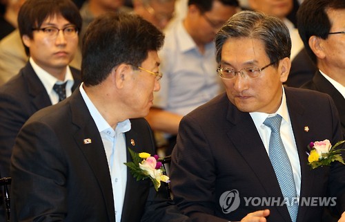 | △ 대화하는 윤상직 장관과 노영민 의원 (청주=연합뉴스) 김형우 기자 = 29일 오전 청주산업단지비즈니스센터 3층에서 열린 '청주산단, 혁신단지 세부 추진방안 마련을 위한 정책토론회'에 참석한 윤상직(왼쪽) 산업통상자원부 장관과 노영민 국회의원이 대화하고 있다. 2015.7.29 vodcast@yna.co.kr |