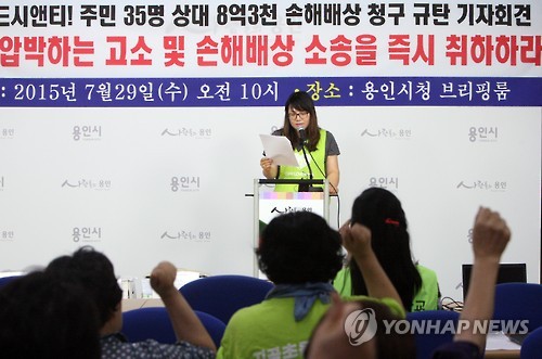 | △ "학교앞 연구소 안돼" 학부모 반발에 업체 소송 '맞불' (용인=연합뉴스) 최종호 기자 = 29일 경기 용인시청에서 지곡초등학교 학부모와 인근 주민 등 30여명이 콘크리트 혼화제 생산업체인 ㈜실크로드시앤티가 학부모·주민 등 35명을 상대로 공사 지연 책임을 물어 8억3천만원을 배상하라는 소송을 제기한 데 대해 비판하는 기자회견을 열고 있다. 업체 측은 지난해 지곡초 앞 부아산 중턱에 콘크리트 연구소 건립을 추진 중이지만 유해물질 배출, 산림 파괴, 학생 안전사고 우려 등을 이유로 내세운 학부모와 주민 반발에 부딪혀 공사를 진행하지 못하자 최근 손해배상 소송을 청구했다. 2015.7.29 zorba@yna.co.kr |