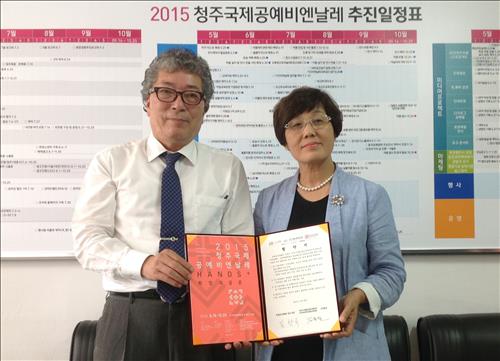 | △ (청주=연합뉴스) 전창해 기자 = 2015 청주국제공예비엔날레 조직위원회(이하 조직위)는 29일 천통음식문화원 '찬선'과 비엔날레 성공 개최를 위한 업무협약을 했다. 김호일(왼쪽) 조직위 사무총장과 김향숙 찬선 원장이 협약 체결 후 기념촬영을 하고 있다. 20-15.7.29 <<청주시 제공>> |