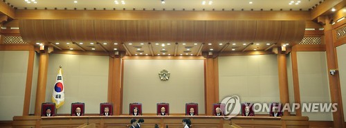 | △ 헌재 "서해 천수만 해역, 홍성군-태안군 나눠 가져야" (서울=연합뉴스) 이정훈 기자 = 박한철 헌법재판소장(가운데)과 재판관들이 30일 오후 서울 종로구 헌법재판소 대심판정에 입장, 착석해 있다. 헌법재판소는 이날 서해 죽도 인근 상펄어장을 둘러싼 충남 홍성군과 태안군의 권한쟁의 사건에서 등거리 중간선 원칙에 따라 두 지방자치단체가 해역을 나눠가져야 한다고 결정했다. 2015.7.30 uwg806@yna.co.kr |
