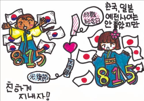 삐뚤 빼뚤 서투른 글씨와 함께 태극기를 든 한복을 입은 소녀와 일장기를 든 기모노를 입은 소녀가 두 팔을 활짝 벌리고 웃고 있다.