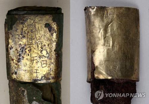 (서울=연합뉴스) 박상현 기자 = 신라시대 적석목곽분(돌무지덧널무덤)인 경주 금관총에서 '이사지왕도'(爾斯智王刀)라는 글자가 새겨진 칼집이 출토됐다.