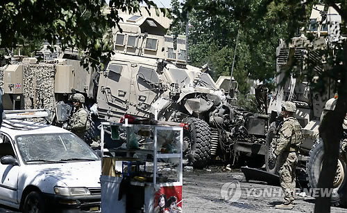 | △ 아프간서 나토군 차량 겨냥 자폭테러 (카불 EPA=연합뉴스) 아프가니스탄 수도 카불에서 30일(현지시간) 북대서양조약기구(나토) 군차량을 겨냥한 탈레반의 자살폭탄 테러가 발생해 민간인 등 20여 명의 사상자가 발생했다. 사진은 이날 카불 시내 미국 대사관 인근의 테러 현장을 나토 군인들이 지키고 있는 모습. 2010596@yna.co.kr |