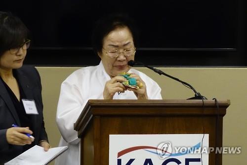 | △ 일본군위안부 피해자 이용수 할머니가 지난 28일(현지시간) 미국 워싱턴DC의 레이번 의원회관에서 열린 미국 하원의 일본군위안부 결의안 채택 8주년 기념식에 참석해 발언하던 도중 눈물을 흘리고 있다. |