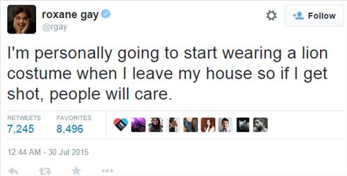 작가인 록산느 게이는 트위터에서 만약 흑인이 사자 복장을 한다면 더 많은 관심을 받을 것이라고 풍자했다.