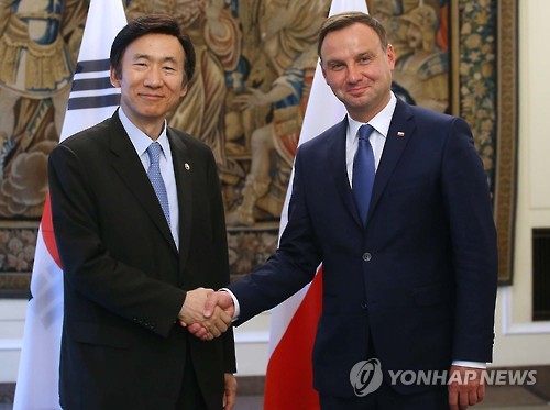 | △ 폴란드 대통령 당선인 예방한 윤병세 장관 (바르샤바<폴란드>=연합뉴스) 김도훈 기자 = 유라시아 친선특급 행사로 폴란드를 방문 중인 윤병세 외교부장관이 30일(현지시간) 폭살 거리에 위치한 대통령 당선인 사무실을 예방해 안제이 두다 당선인과 악수를 하고 있다. |