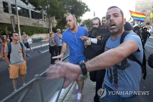(서울=연합뉴스) 양태삼 기자 = 30일(현지시간) 이스라엘의 예루살렘에서 열린 '게이 프라이드'(동성애자의 자긍심) 행진에서 한 초정통파 유대교 신도가 흉기를 휘둘러 6명이 다쳤다고 외신들이 보도했다.