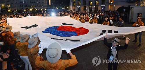 | △ 통일 염원을 담은 태극기 (베를린=연합뉴스) 김도훈 기자 = 독일 베를린 브란덴부르크문 앞에서 열린 유라시아 친선특급 폐막 음악회에서 참가자들이 통일 염원을 담은 대형 태극기를 펼치고 있다. 이 태극기는 한복 디자이너 권진순 씨가 유라시아 친선특급 참가단 및 각 도시 시민들로부터 받은 통일 염원 메시지를 적은 천조각 1천여 장을 모아 만들었다. 이번 음악회에는 소프라노 조수미, 피아니스트 백건우, 김덕수 사물놀이패, 지휘자 지중배, 구동독 출신 지휘자 유르겐 브룬스가 한반도의 통일을 염원하는 공연을 펼쳤다. |
