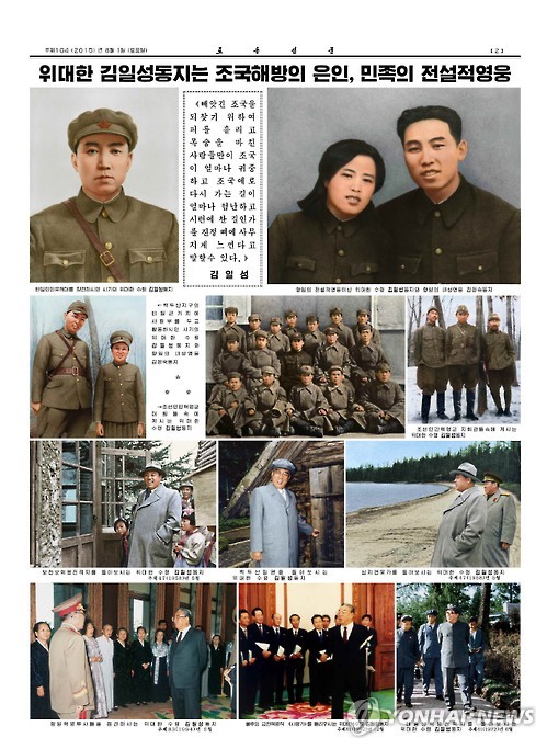 | △ 북한 노동신문, 김일성 사진 특집 (서울=연합뉴스) 북한 노동당 기관지 노동신문은 광복 70주년을 맞아 1일 김정은 국방위원회 제1위원장의 할아버지 김일성 관련 특집 사진을 게재했다. 2015. 8. 1 nkphoto@yna.co.kr |