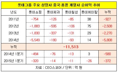 <표> 롯데그룹, 2011∼2014년 중국·홍콩 계열사 적자규모