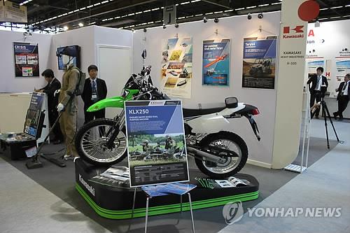 | △ 일본 가와사키 중공업이 2014년 6월 18일(현지시간) 프랑스 파리 교외에서 열린 세계 최대 무기 전시회 '유로 사토리'에 지뢰탐지기와 오토바이 등을 선보이고 있다.(연합뉴스 자료사진) |
