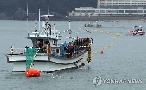 | △ 해운대에 해파리 차단 그물 설치 (부산=연합뉴스) 조정호 기자 = 20일 부산 해운대해수욕장에서 '여름철 불청객' 해파리를 차단하는 대형 그물이 설치되고 있다. 해파리 차단망은 물놀이객 통제선 외곽에 길이 1.4㎞, 수심 6m 규모로 설치된다. 2015.7.20 ccho@yna.co.kr |
