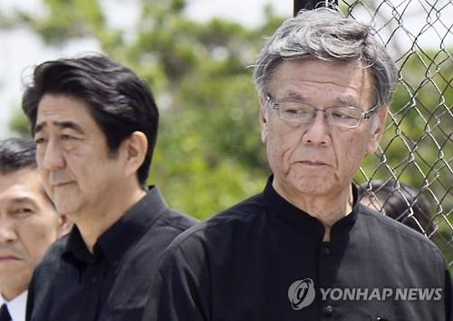 | △ 아베 신조(왼쪽) 일본 총리와 오나가 다케시 오키나와현 지사(교도=연합뉴스 자료사진) |
