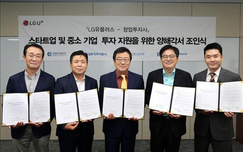 | △ 사진 왼쪽부터 쿨리지코너인베스트먼트 권혁태 대표, 유안타인베스트먼트 황상운 대표, LG유플러스 SD본부 김선태 부사장, 마젤란기술투자 여주상 대표, 보광창업투자 임정혁 팀장. |