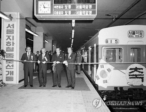 | △ 서울지하철 1호선 개통식 (서울=연합뉴스) 행정자치부 국가기록원이 서울지하철 1호선 개통일(’74.8.15)을 맞아 지하철 건설 등과 관련한 사진을 공개했다. 사진은 1974년 서울지하철 1호선 개통식. (국가기록원 제공) |